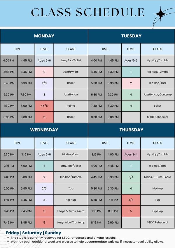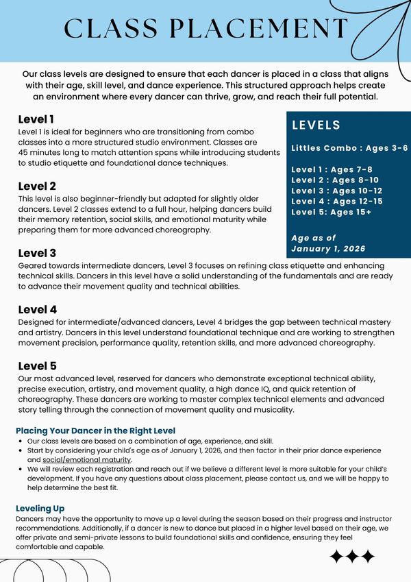 Our class levels are designed based on a blend of recommended age ranges, skill levels, prior dance experience, ability to focus, memory retention, and other relevant factors. This ensures that each dancer is placed in a class that best matches their abilities, while creating a space for each dancer to reach their full potential.
